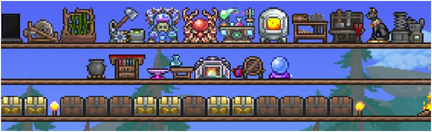 第二排放重要的,稍矮的合成台,铁砧,工作台,熔炉,工匠作坊摆中间。