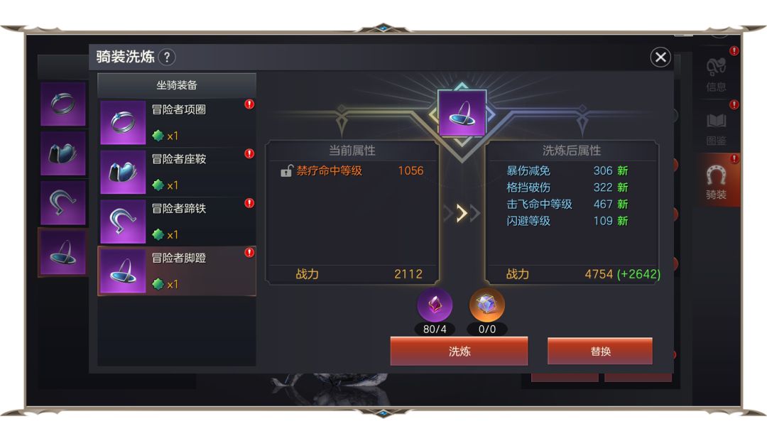 通过材料对骑装洗炼后让你的坐骑提升至更高的战力,也可以选择提供多种强化属性哦~