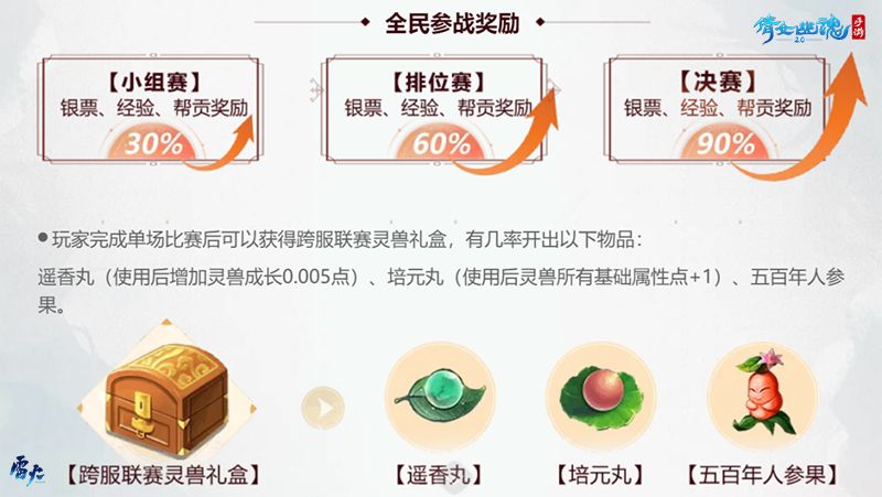 本次联赛主副战场的迭代将会对赛事产生重要影响。战场将新增【联赛神坛】,帮众可以领取攻击或者防御增益。此外,主战场人数限制提升至40人,排兵布阵时将带来全新体验。同时,副战场将新增小神兽,击杀后可为主副战场提供攻击增益次数。每个大区获得冠亚季军的帮会将获得专属帮会装饰物,前8名服务器的帮会成员将获得专属称号,所有参与跨服联赛的帮会成员都将获得获得大量银票、经验及帮贡奖励。