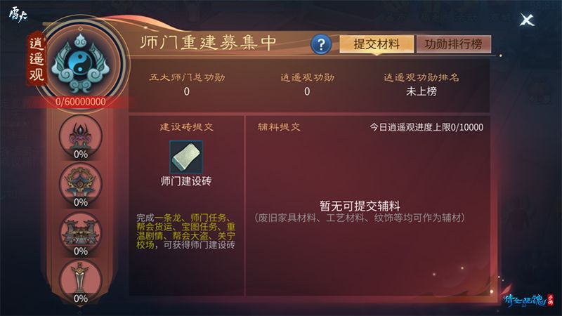 近日,三界各掌门重焕容光。自孟思归布局,利用妖兽和时空门搅弄风云后,五大师门损毁,只留下断壁残垣。为重整各派声威,平复伤痕,各派决心重建师门。12月16日起,玩家可以通过日常活动获得师门建设砖,并在师门重建界面提交。此外,玩家还可以提交废旧家具材料、工艺材料、纹饰道具作为辅料。提交材料成功的玩家均可获得师门功勋。师门重建完成后,系统将根据【功勋值排行榜】的排名名次予以玩家相应重建谢礼。师门奖章、吴山石、金刚钻及宝匣钥匙等丰富奖励等你来拿!