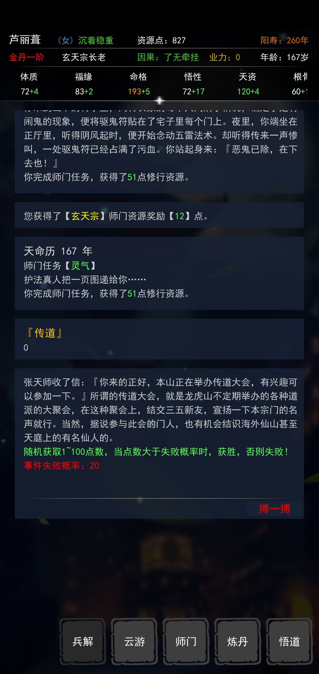 宗门职位达到护法(长老)时,继续点击师门会出现师门概率事件,继续点击搏一搏就会出现告示,且游戏卡死,不能兵解。
