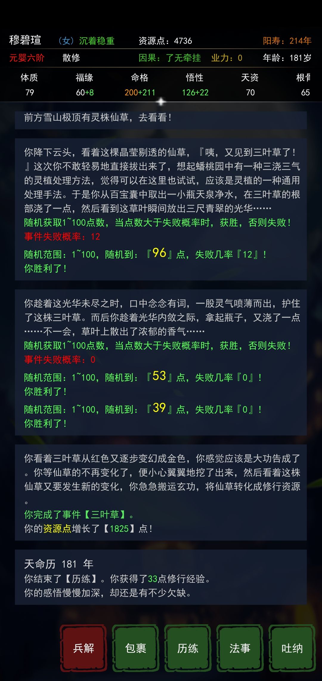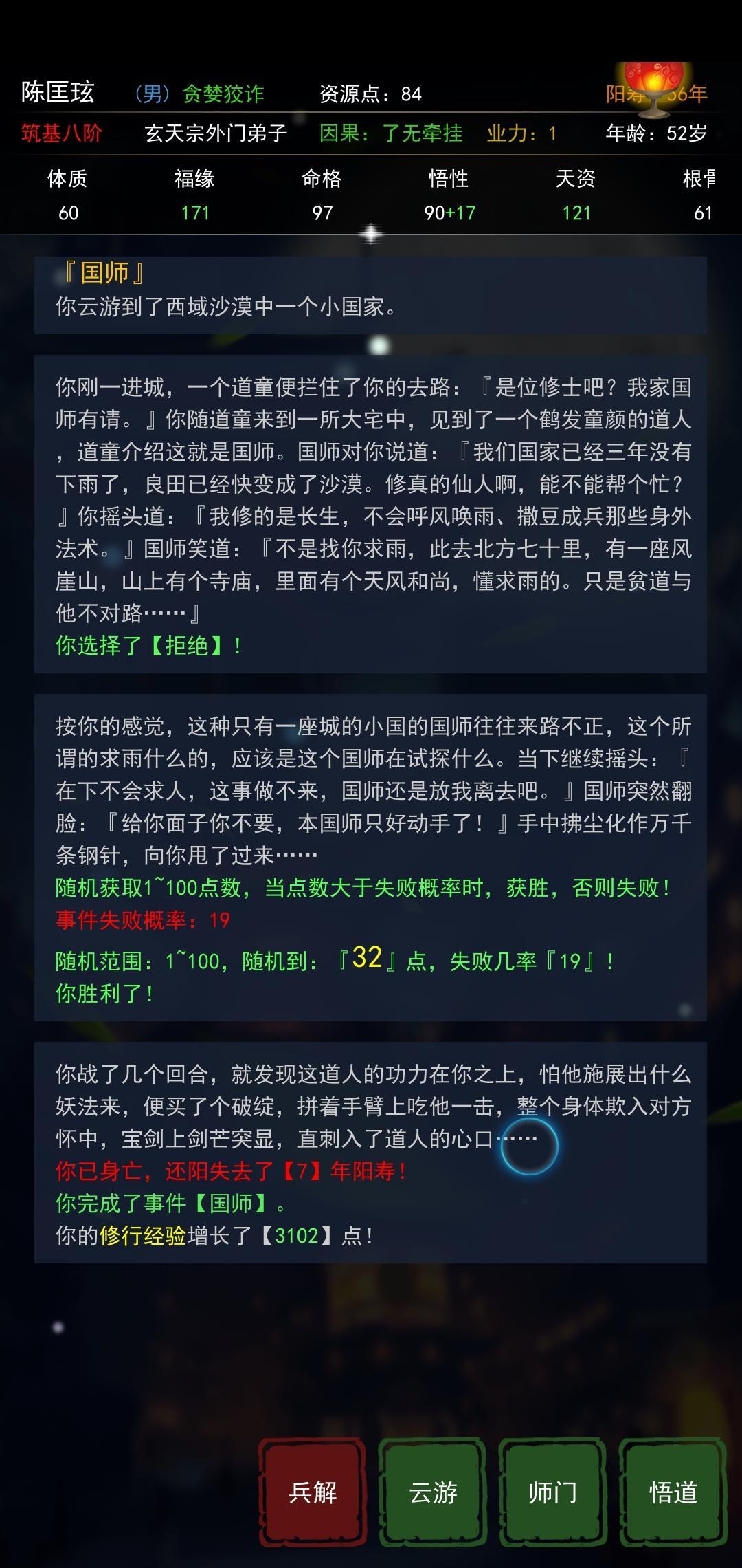 在选择拒绝以后,直面国师,打赢国师既获得修为又判定死亡,白白地浪费角色阳寿。