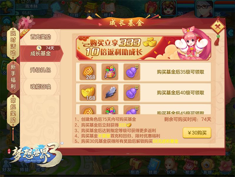 新服推出成长基金,30元可购买,购买后立刻获得等价值金币,达到指定等级还可领取包含金币在内的各种返利,总价值高达10倍!获得所有基金奖励后还可解锁购买68元进阶基金。