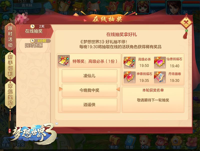 在线好礼抽不停,新服开启后,每晚19:30将开启在线抽奖活动,在线活跃的角色将有机会获得高级必杀、仙兽祝福石、神兽祝福石等稀有奖品!