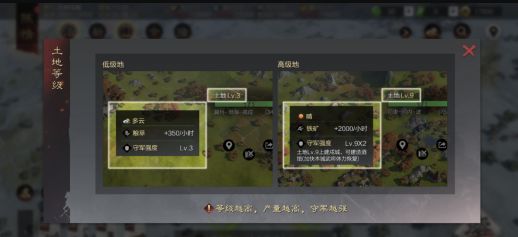 开荒期,就是发育期,是我们需要积累资源的阶段。资源是率土一切的基础,有木、铁、石、粮四类。资源主要依靠土地获取,有相对应的木、铁、石、粮四类土地。土地等级越高,提供的资源越丰富,但也越难占领。