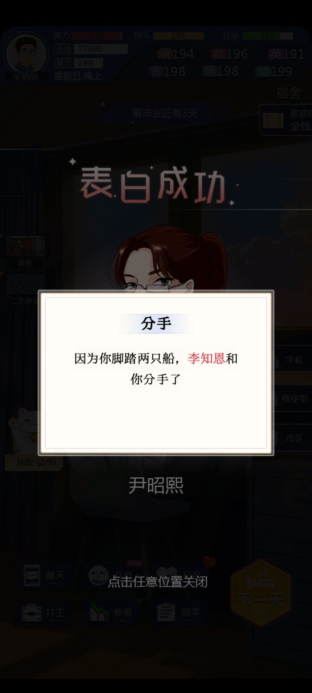气死我了,为什么阿,不是说可以双女友甚至三女友吗?我这一局先和安静在一起了,然后又和发小在一起结果安静就和我分手了,然后我又不死心撩老师,撩到了老师发小又和我分手了,迷惑操作。奇怪的是和安静分手时我也是脚踏两条船但是没有人降好感度,和李知恩分手她们就全部-20呜呜呜,所以李知恩是游戏宠儿是吗