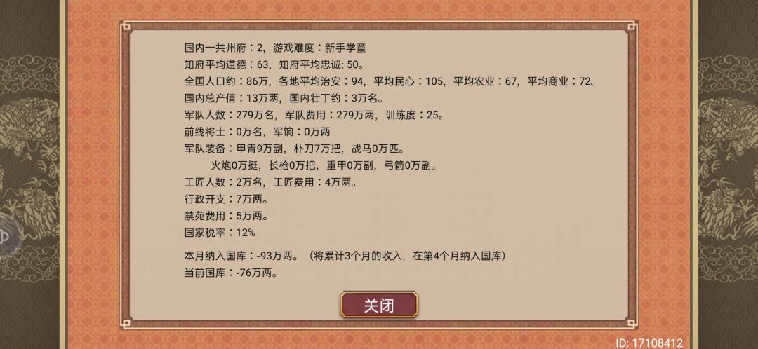 再看实测的结果,这是第一个月的,民心小于80.总壮丁22万,士兵12万