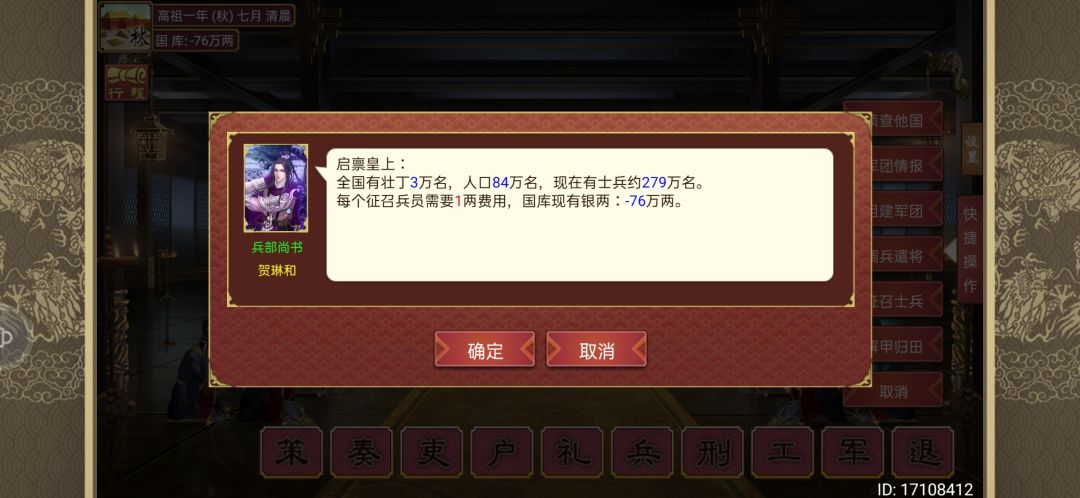 然后是第三个月民心≥80.士兵是118万,壮丁也剩3万,12万的5%怎么也算不到100多万那,就算是总人口也不至于