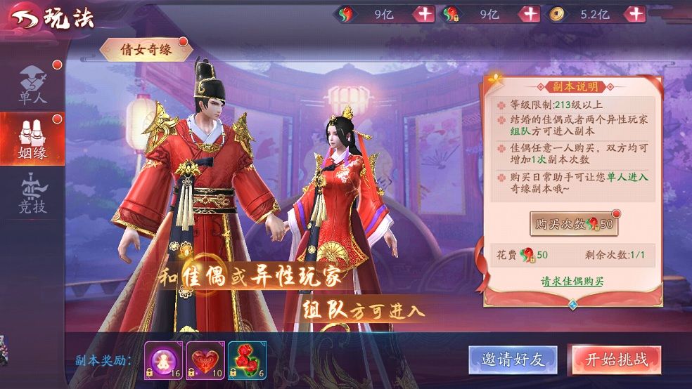 倩女奇缘需要成为佳偶或者2个异性玩家才能挑战。挑战次数需要购买(50勾玉1次),只要有1人购买就可以为双方增加1次挑战次数。