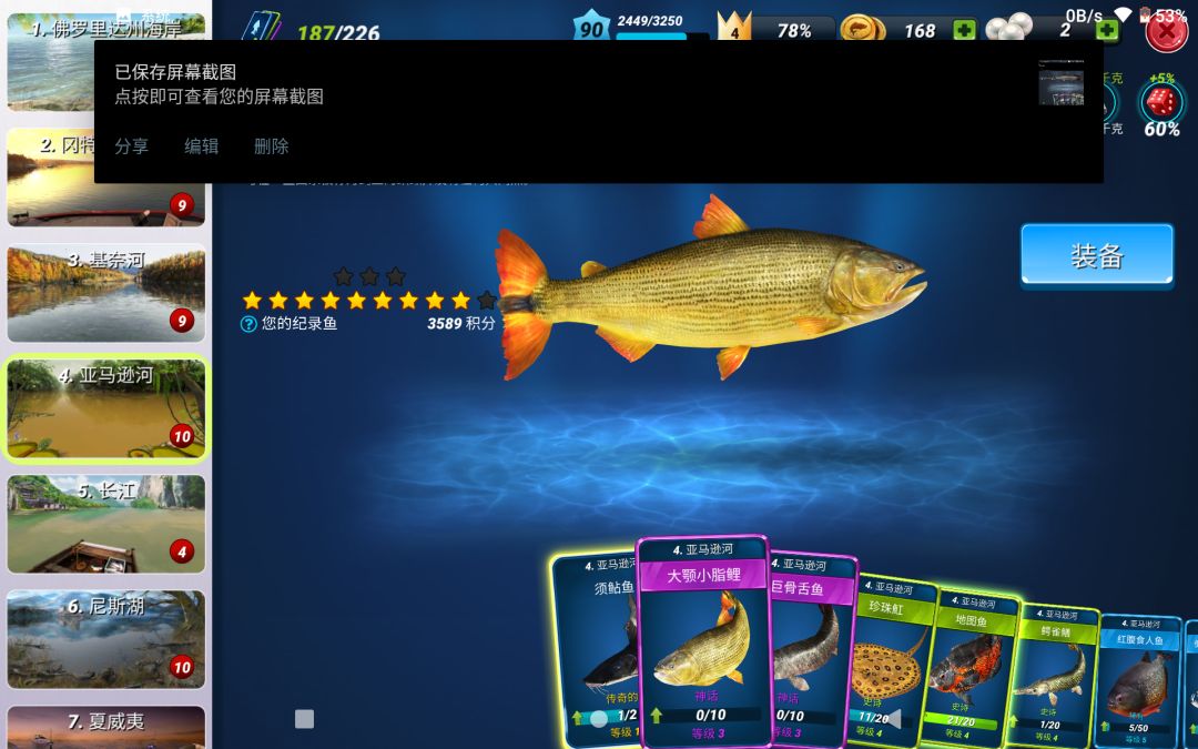 亚马逊河的神话鱼一条最少也有两星。三星就有1000分了。在渔场饵里,只有运气好的玩家才能钓到。