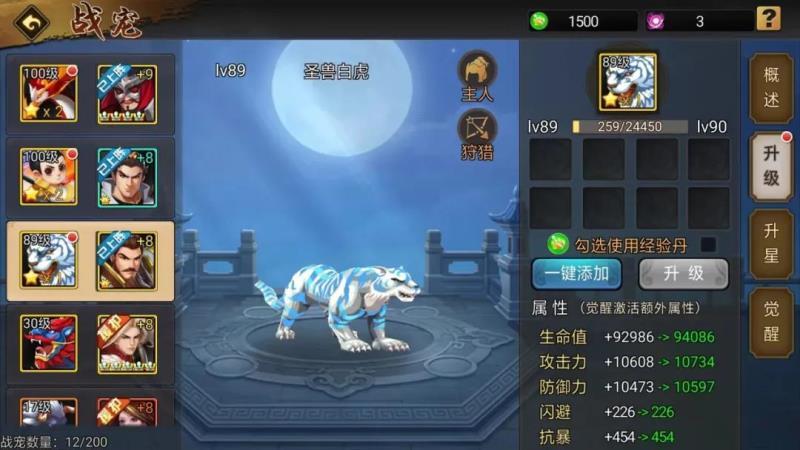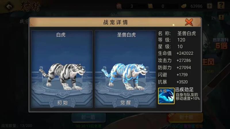 着玩家养成的深入,在足够数量战宠内丹不断冲击瓶颈,觉醒变异后化身圣兽,就仿如武林高手,神功大成,所向披靡,摇身一变成就至深高度,基础属性攀升、激活额外的变异属性闪避和抗暴,同时增加一个专属技能位,获得天赋专技:迅疾劲足,提升自身和队友的移动速度。战宠基础属性和变异属性带入各类场景,白虎的闪避属性,一直是玩家致力追求的一类极致属性,闪避的作用顾名思义,是能让对方武将无法攻击到或者在连招的过程中突然断招。闪避的触发存在着一定的几率,出现的几率体现在你与对手命中数据的差异值,你的闪避数值比对方的命中数值越高,则对方打你的时候出现闪避的几率越大,这也是为什么主公们极致追求高闪避的缘由所在,在竞技中触发的频率越高,逆转战局的机会就越大,光看变异属性,圣兽白虎称得上“排位专宠