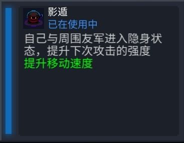 刺客和友方进入6s的隐身状态,敌人不会对刺客发动攻击;隐身后下一次攻击伤害变为原来的3倍(连击武器1.5倍),且子弹变大;cd4s,冷缩后3s。