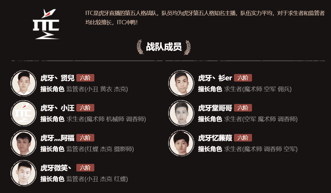 当时的代表队伍就是Gr和ITC。 ITC这支队伍的求生者非常的强,首先他们有蒹葭这样非常优秀的牵制位选手——我对这名选手的印象非常深刻。因为我也参与了2018跨平台邀请赛,我们队伍被蒹葭所在的ITC打败,ITC也是那年跨平台邀请赛的冠军,蒹葭的调香师等牵制角色的熟练度非常高,作为监管者的我如果第一个遇到的是蒹葭的调香师,我基本会放弃追他。其次他们的指挥“汪总”头脑清晰,基本能保证“倒得早能保平,倒得晚能赢”。