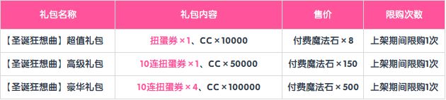 「期间限定 装点圣夜的艺术家Pickup扭蛋」举办期间,魔法石商店将限时上架活动限购礼包——【圣诞狂想曲】系列礼包,礼包详情见配图。
