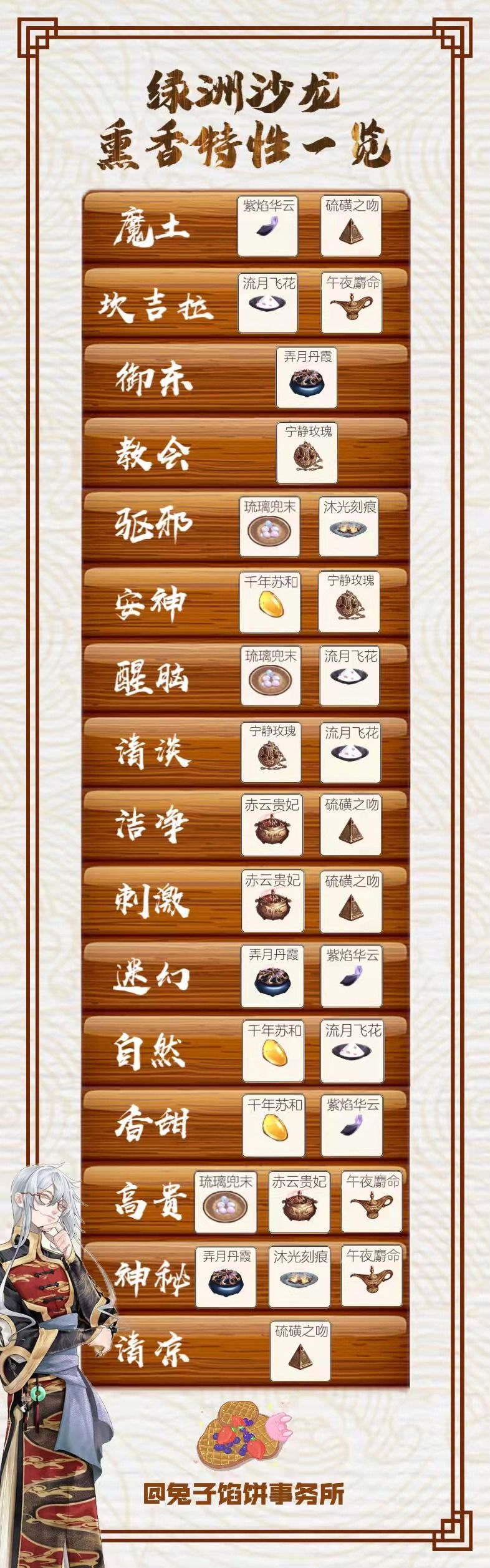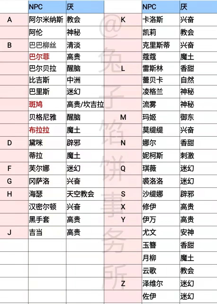 由于初级版攻略我们没有考虑到熏香特性,以及NPC的厌恶心情,于是我们便又重新测了一遍NPC,此攻略可做辅助,不过兔兔还是要提醒大家,一定一定一定要看讨厌特性!