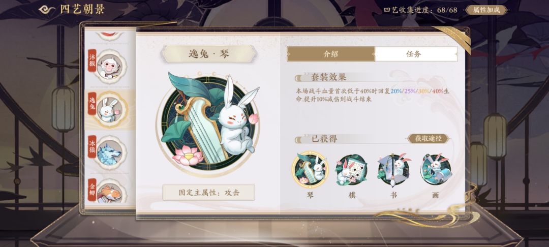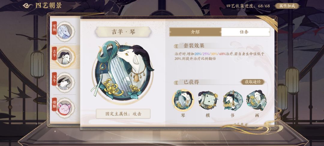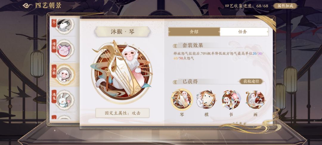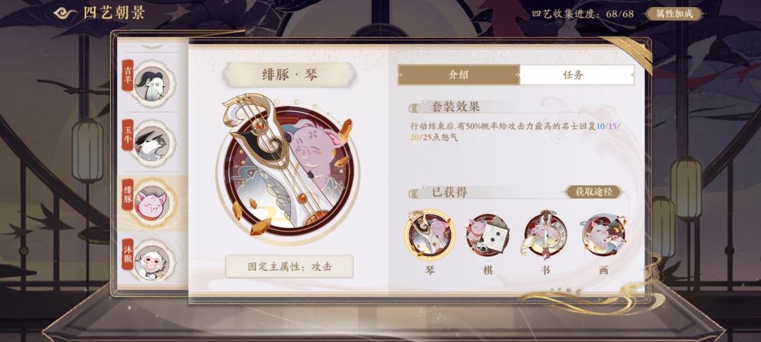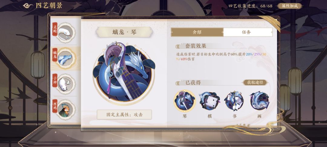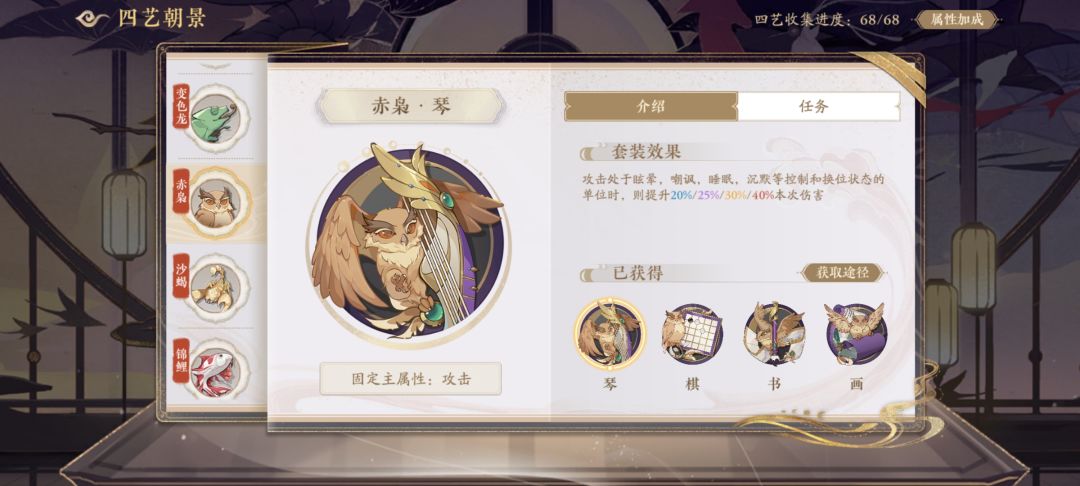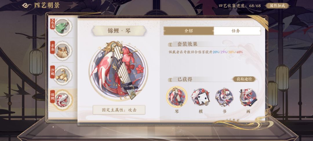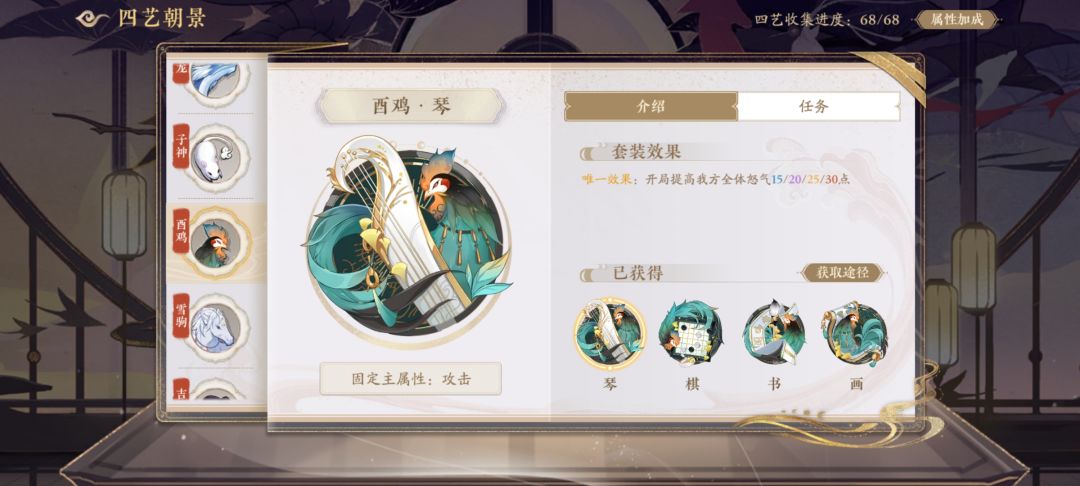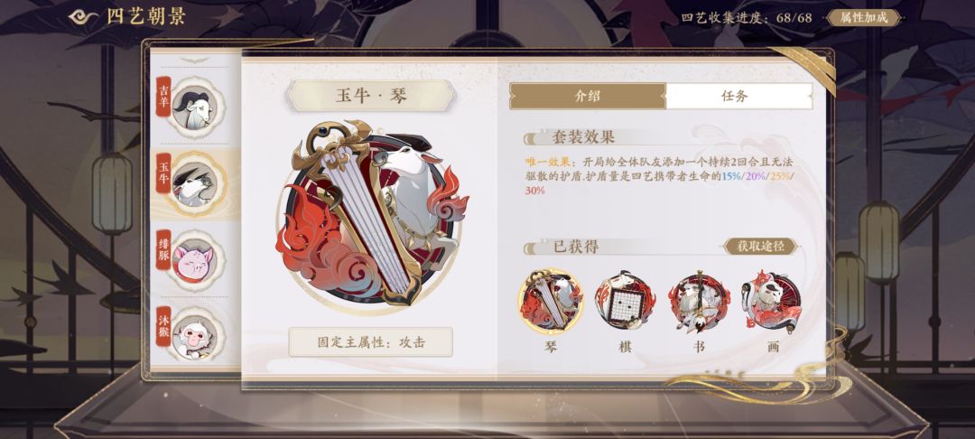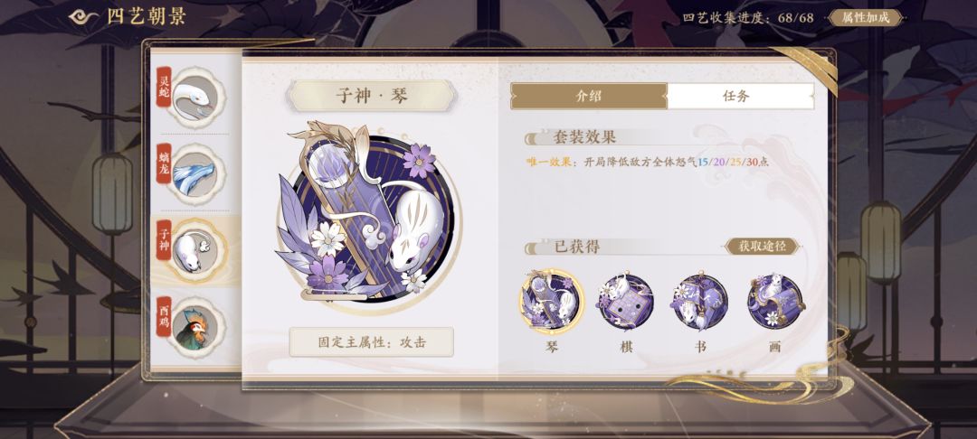 首先四艺有四种品质,蓝紫橙红,品质越高效果越好,然后四艺有四个位置,琴棋书画,主属性对应的分别是攻击生命防御先手,副属性都是随机(副属性可以重复),四艺每升两级强化一个副属性。