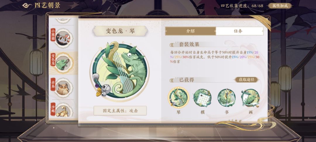 变色龙:生命高于50%提供免伤,低于50%提高增伤。个人认为非常有意思的四艺,月怜搭配奶我认为非常强,一直去吃免伤buff,在前排一直抗揍。前排输出都可以带它 ,既有免伤让自己站得住脚,又有增伤补输出。小季也可以带。输出的话就算了,别带了。