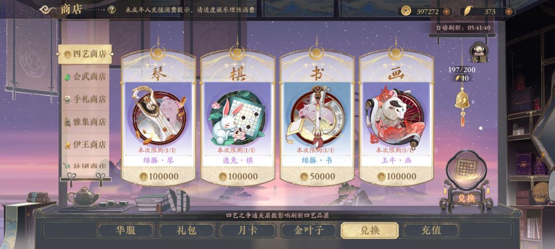 商店四艺,免费刷就够了,不要用叶子,橙套缺那个位置可以去买,蓝紫色就是浪费钱,铜币越往后越缺,不能浪费。