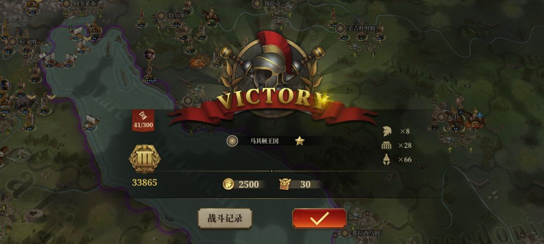共计耗时41回合,任命将领8名,剩余军团66支,占领28座城市中心。