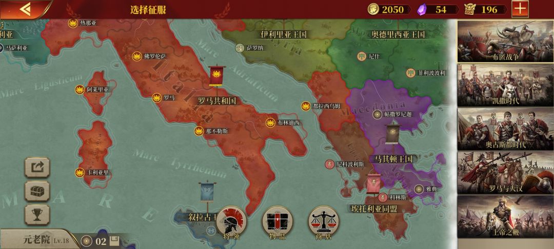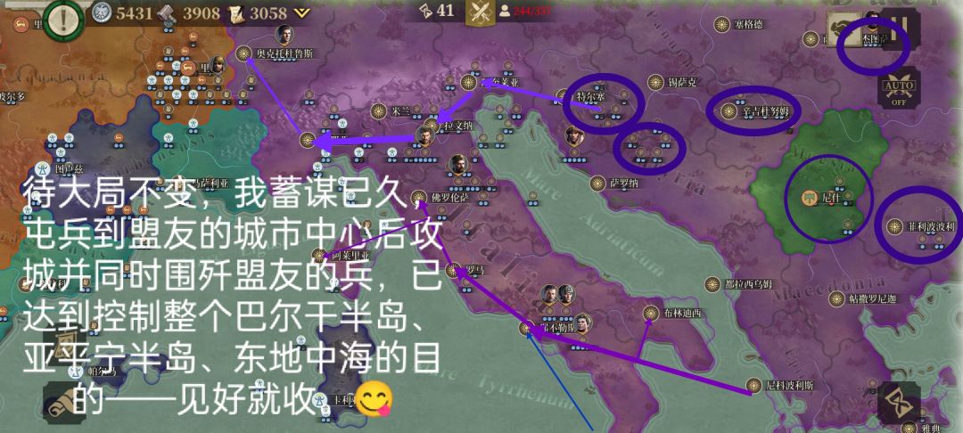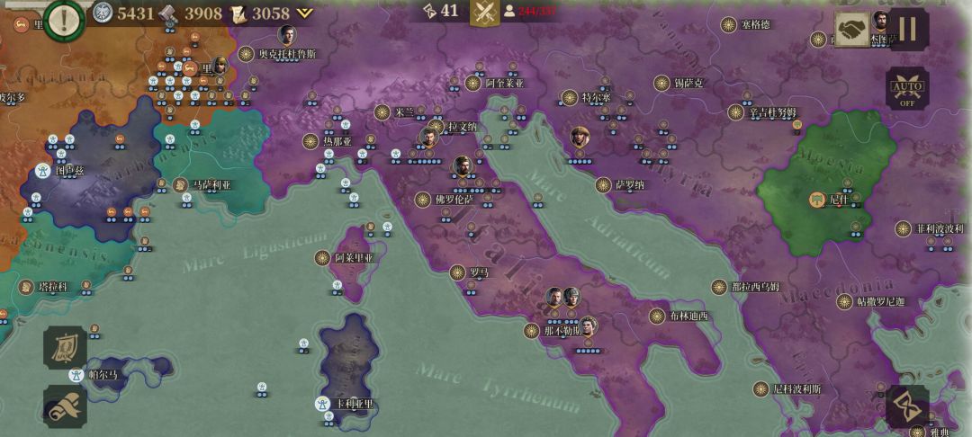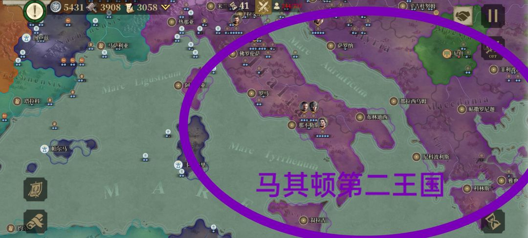 2.乘罗马共和国主力在意大利东北处和高卢西南部所困,我利用很少的兵去进攻他防守兵力很弱,还没升级的意大利南部,然后过了几回合,我占领了那不勒斯、罗马两个重镇。