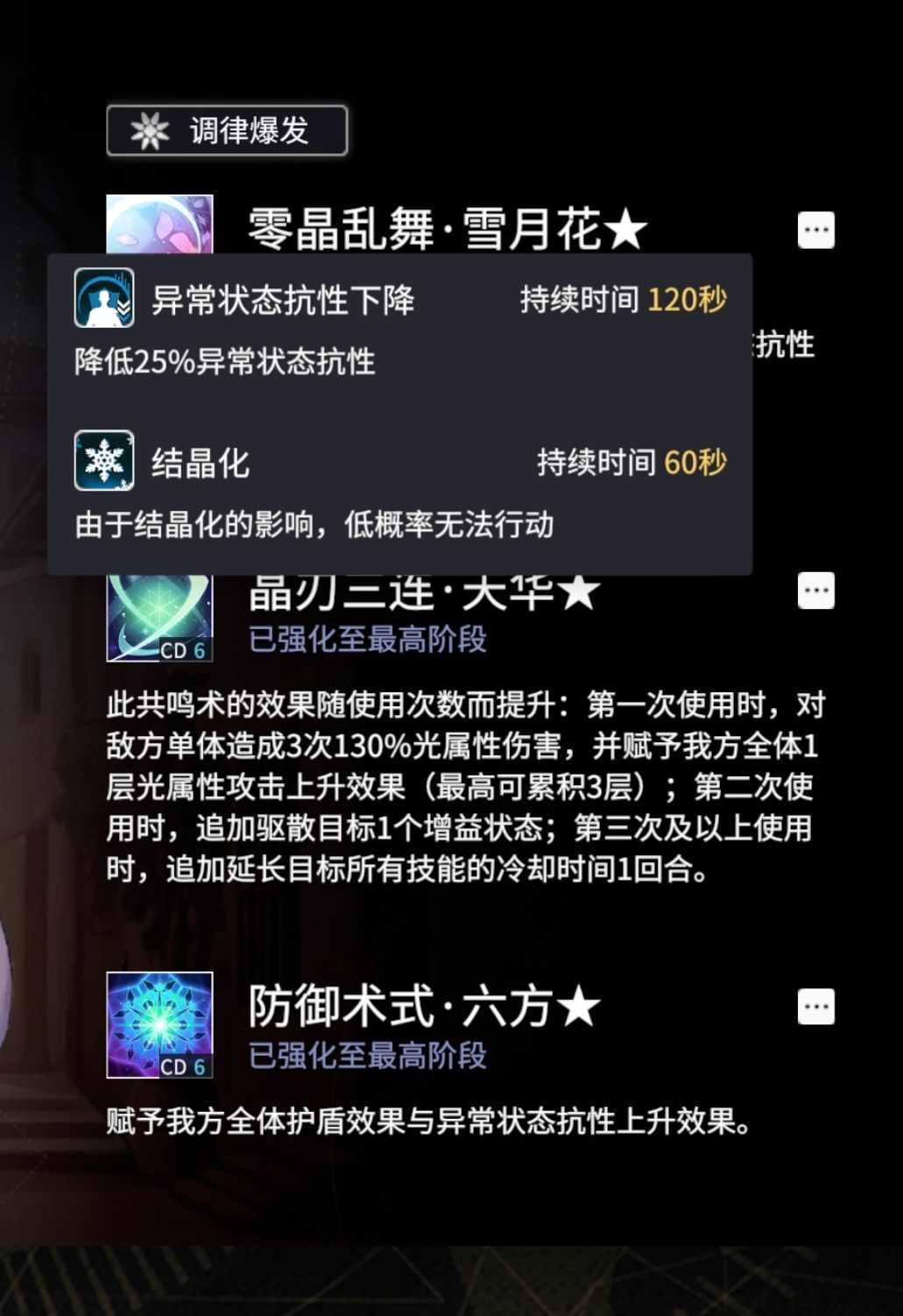 雪拉是本次爬塔的神,虽然是bug,但是没修就能用,毕竟单机游戏。大招无限叠减伤,就是会经常miss,所以我塞满了异常概率增加,全程无miss,我最后叠了9层大招90的减伤,无敌!省点资源44级就行,我是直接拉满了,很肉,共鸣回血减伤也很好用。