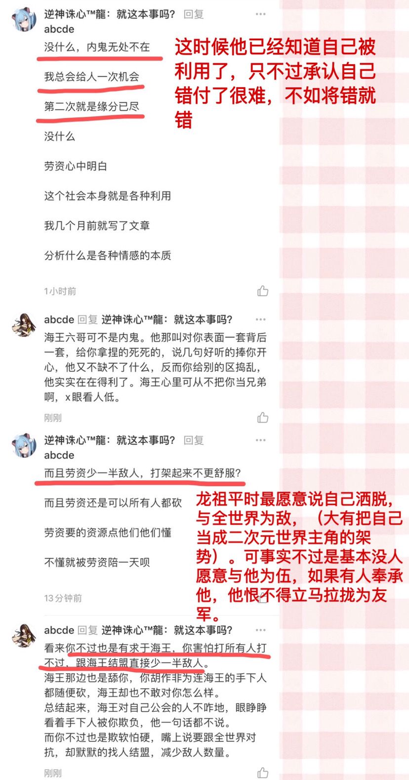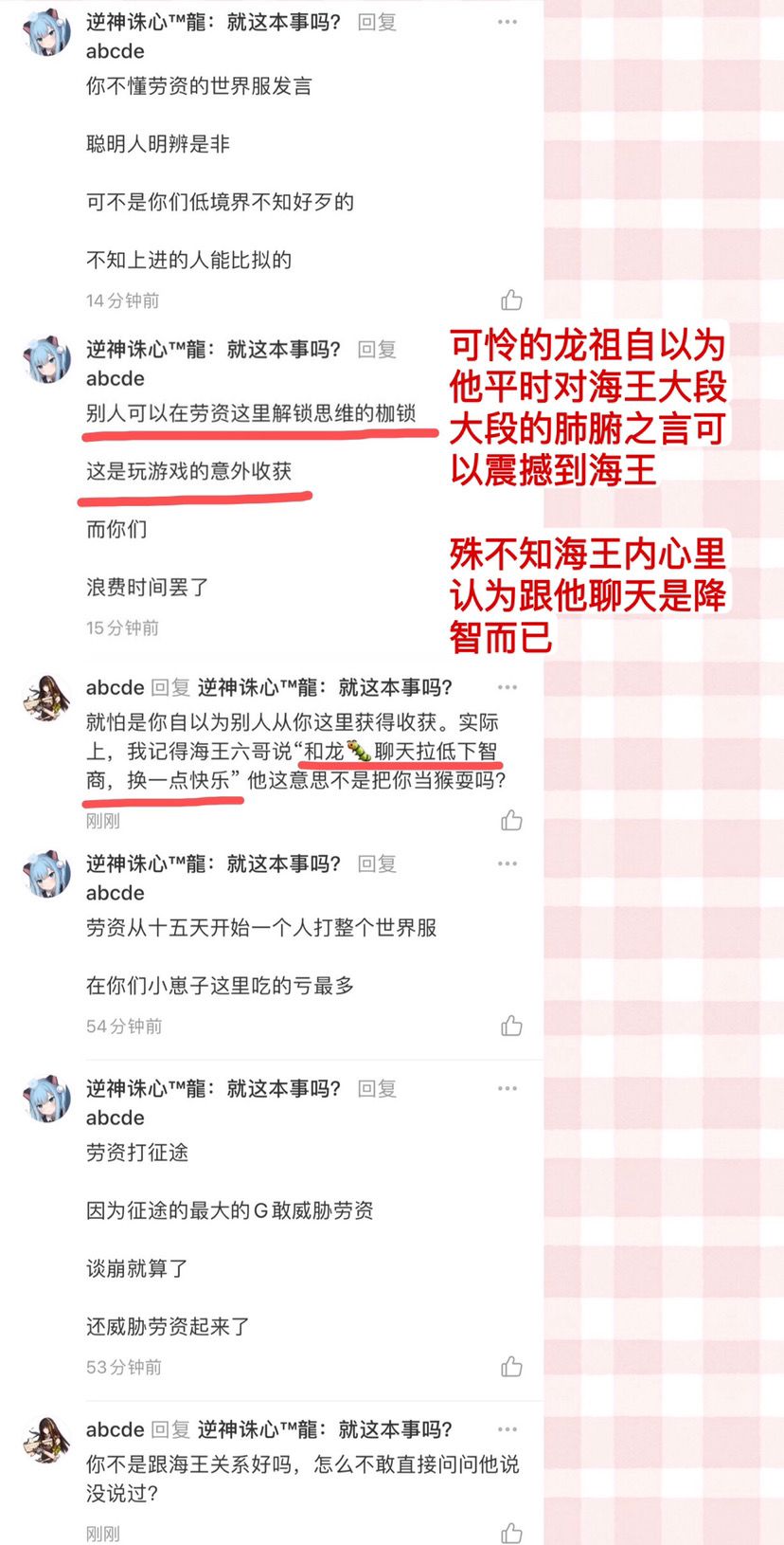 昨天发布的“逍遥与海王那些不得不说的事”贴子,有名热心之士——龙祖在评论区帮海王说话,我也是刚好有空就回复了他几句。
