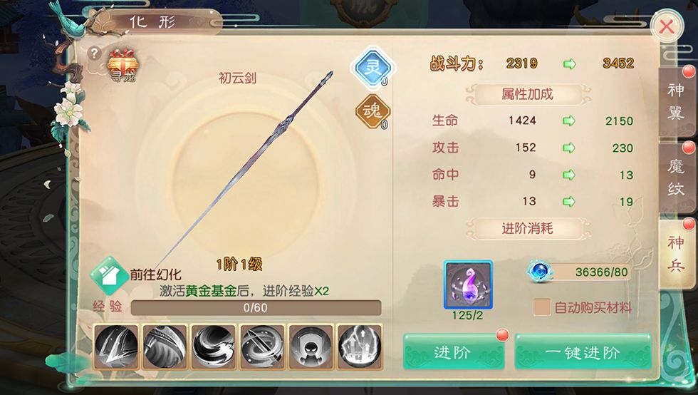 2、提升神兵阶位时可获得更多属性,同时神兵阶位也是激活皮肤幻化的必要条件。