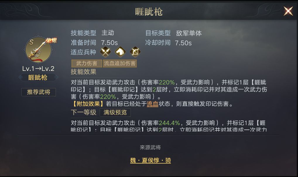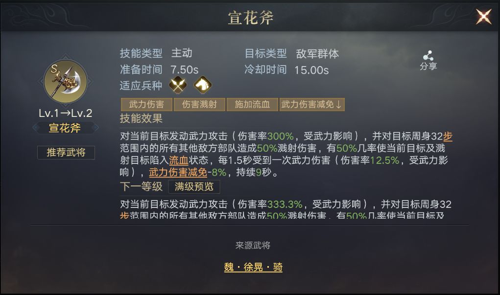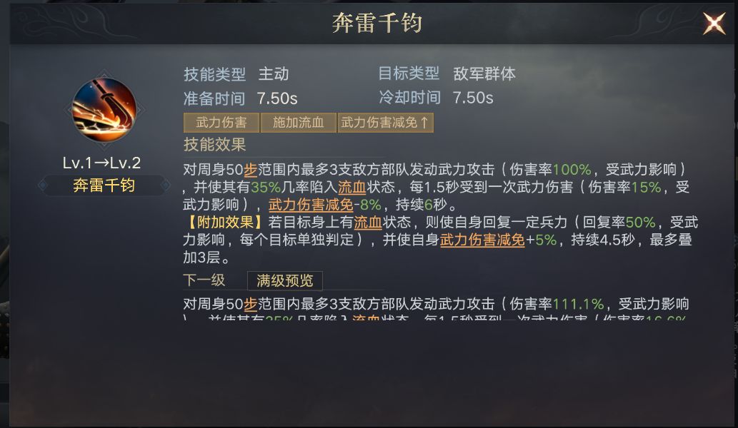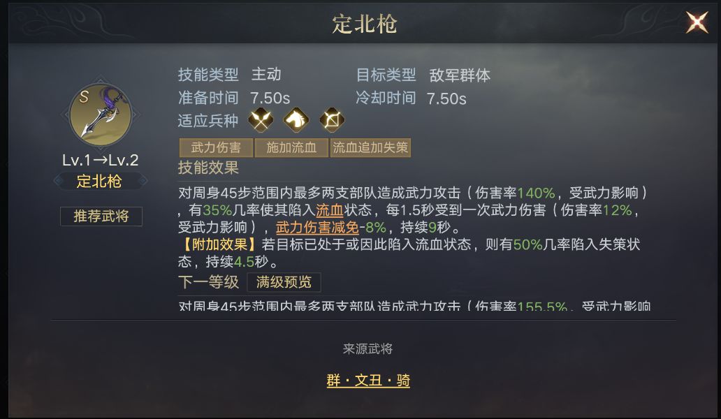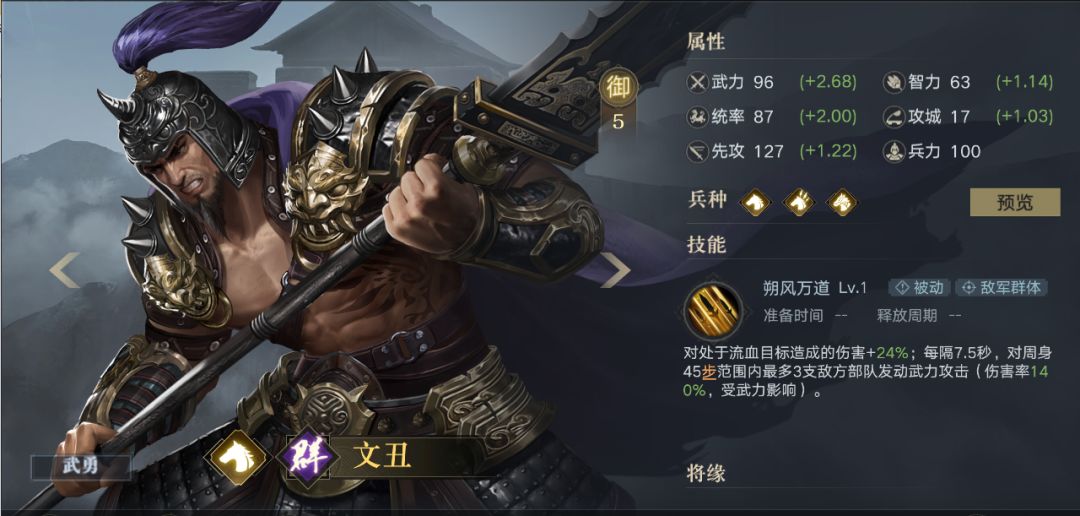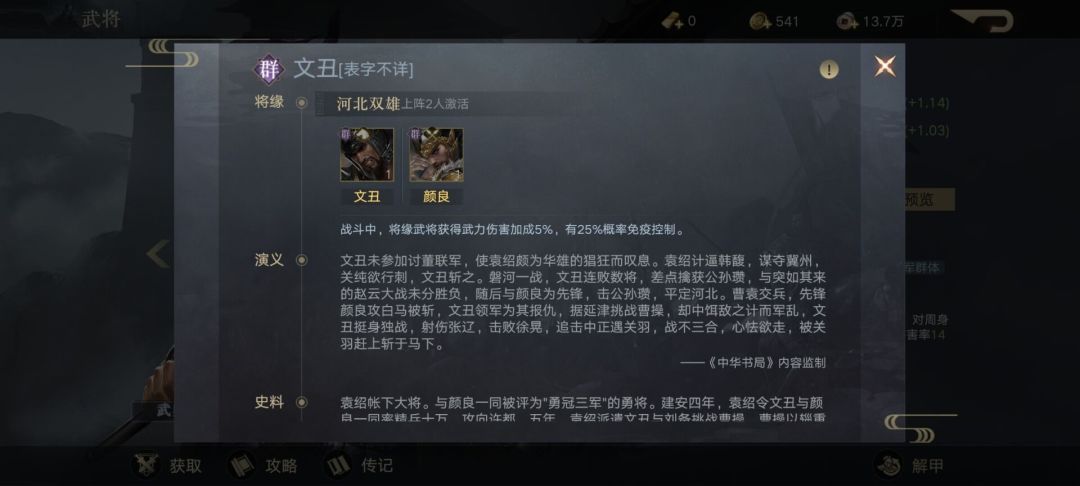 在与颜良组成河北双雄,在战斗中为文丑增加5%的武力伤害加成,以及25%的概率免疫控制。