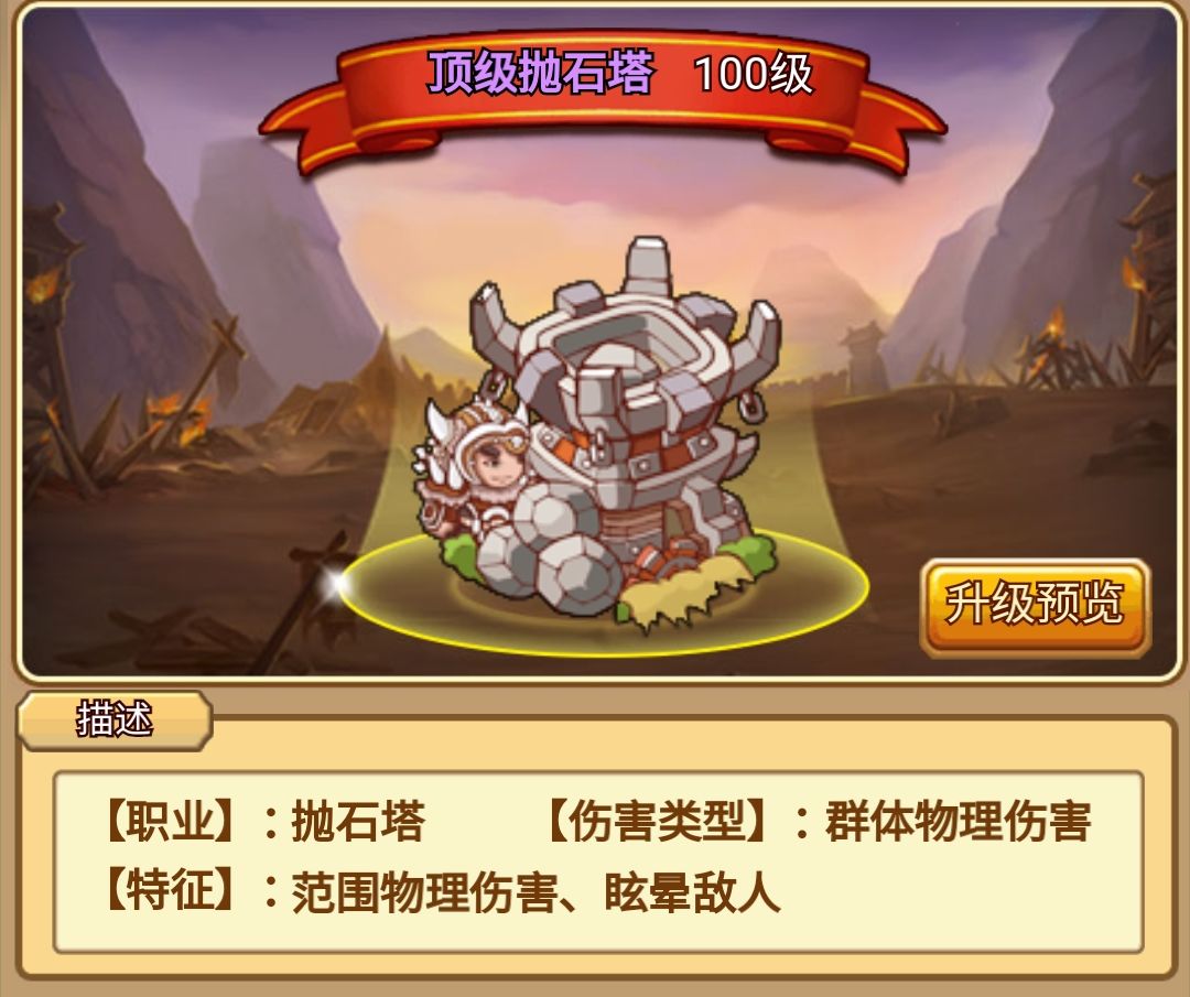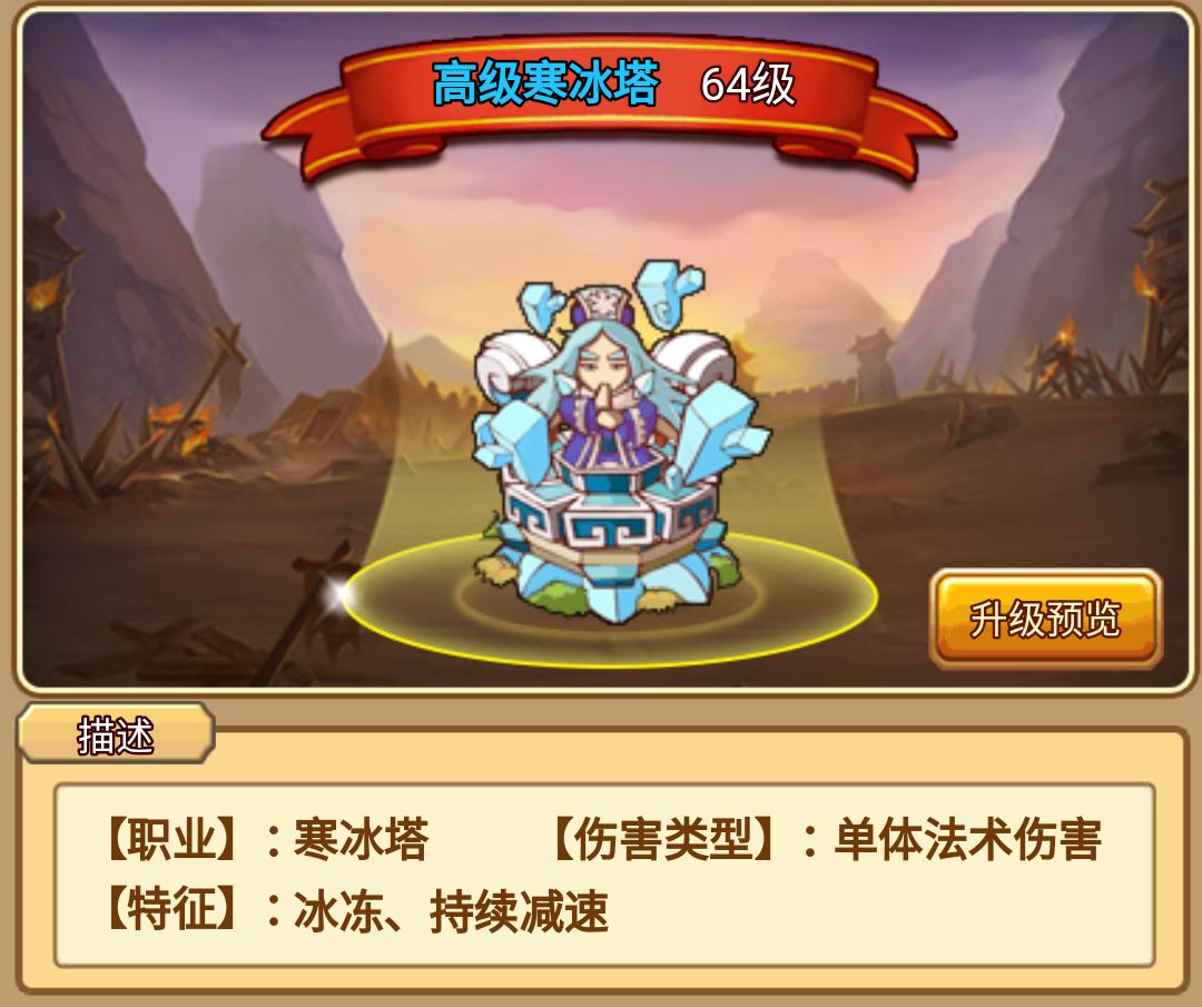 建议在游戏中后期进行升级。寒冰塔有冰冻和减速作用,但是只能针对单个敌军目标。所以我建议闯关中寒冰塔不要放太前,放在抛石塔和唤雷塔的后方,给这两座塔进行补漏。