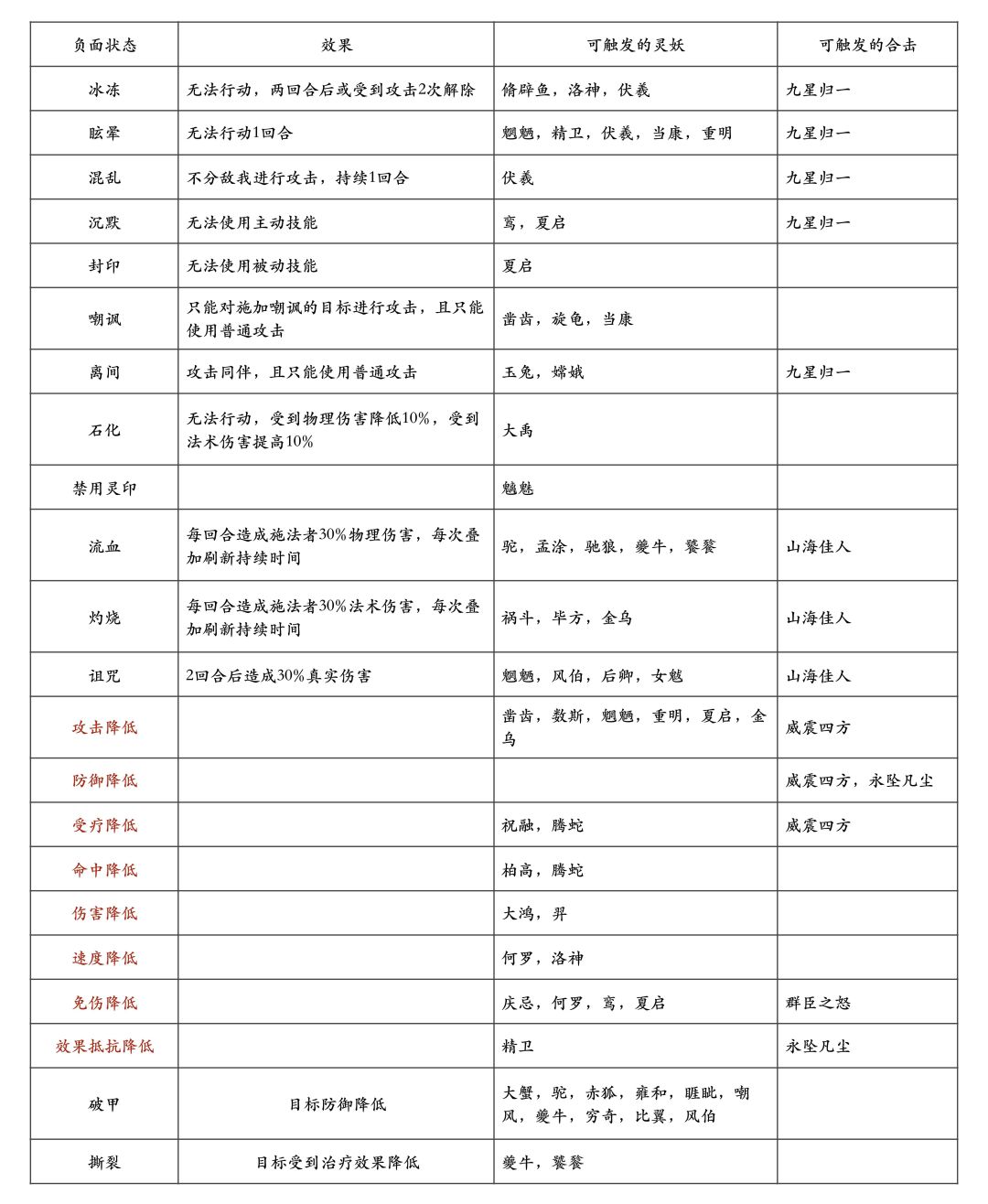 以下是游戏中所有的负面状态和其效果,以及触发该负面状态的灵妖和合击技能。