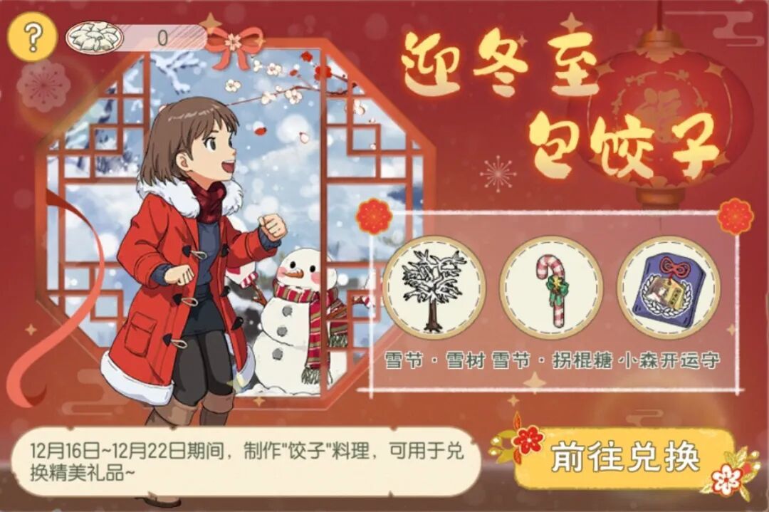 12月16日-12月22日,村民们可以使用饺子皮及馅料制作饺子料理,并可使用饺子在活动商店内兑换精美礼品,包括雪节主题家具:雪节·雪树以及雪节·拐棍糖,另外还有小森开运守可以兑换~福利多多,大家快来和花音一起包饺子吧!