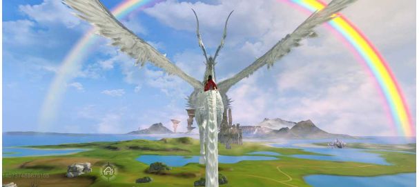 点评:且不论这气派无比的坐骑,能和彩虹贴贴的感觉,就已经非常美好啦!银白色的坐骑展翅高飞,奔向彩虹的尽头,奔向山海的所有的天之涯、海之角!旅者的视角也是非常奈斯的~