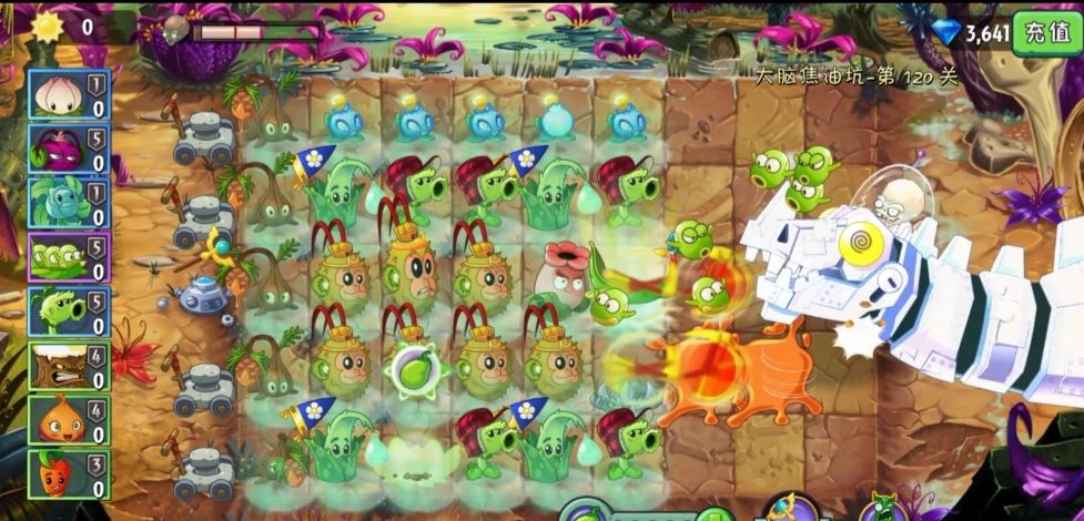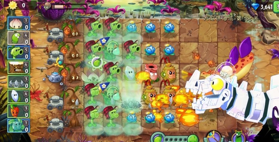恐龙机械僵尸可靠眼睛发射一道激光,扫过整行杀死植物与僵尸的同时把该行化作无法种植植物的焦土。