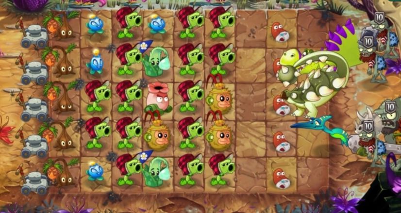 甲龙,在入场后,当有僵尸进入第九格时,甲龙将会挥动尾巴,将僵尸击至本行存在植物的最右列的同时将该植物击退一格。与该植物相邻的本行植物同样响应击退效果。当本行无植物时,甲龙可以把僵尸击至最远第二列的位置。挥动尾巴的动作进行5次后,或甲龙在场中停30秒后,它将离开。