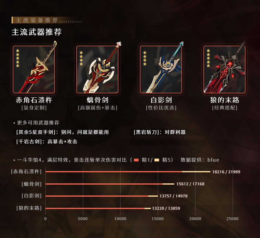大月卡武器,老玩家大概率已经精5的强力双手剑,用过都说好!没有精5的玩家如果有氪大月卡的打算,从性价比的角度出发可以不用抽取赤角石溃杵,精1红刀只领先精5螭骨10%左右。而且外观与一斗很搭。