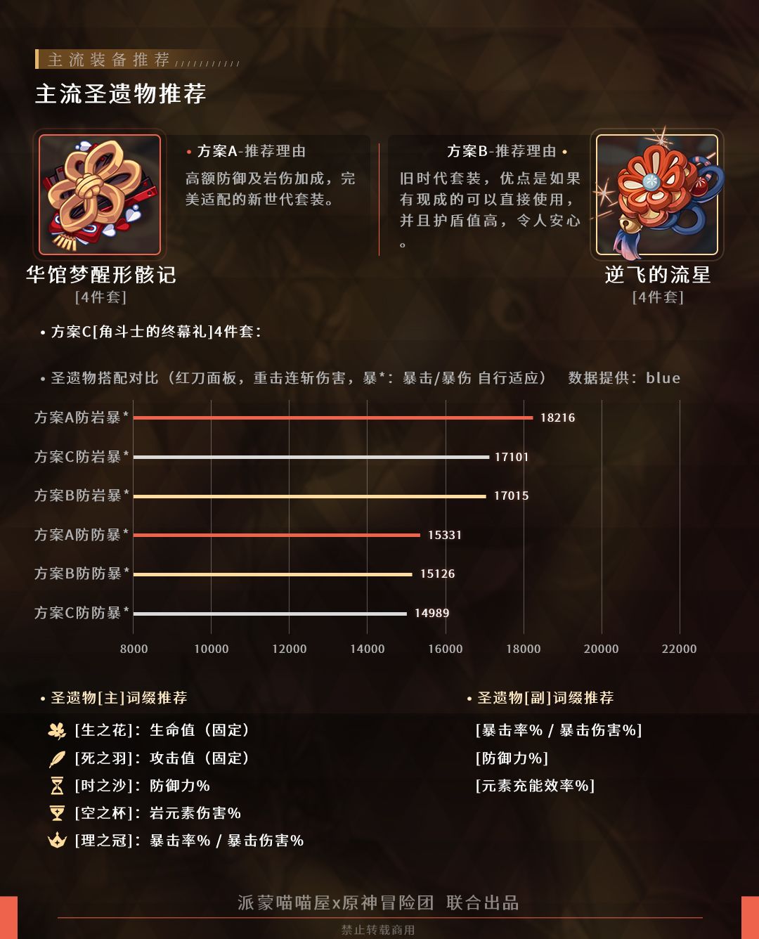 对一斗来说主属性的正确选择比套装更为重要,易证,同词条数的防御力收益高于攻击力,直接确定防御沙的选择。杯子必然选择岩杯,岩杯带来的提升要远高于防御杯。