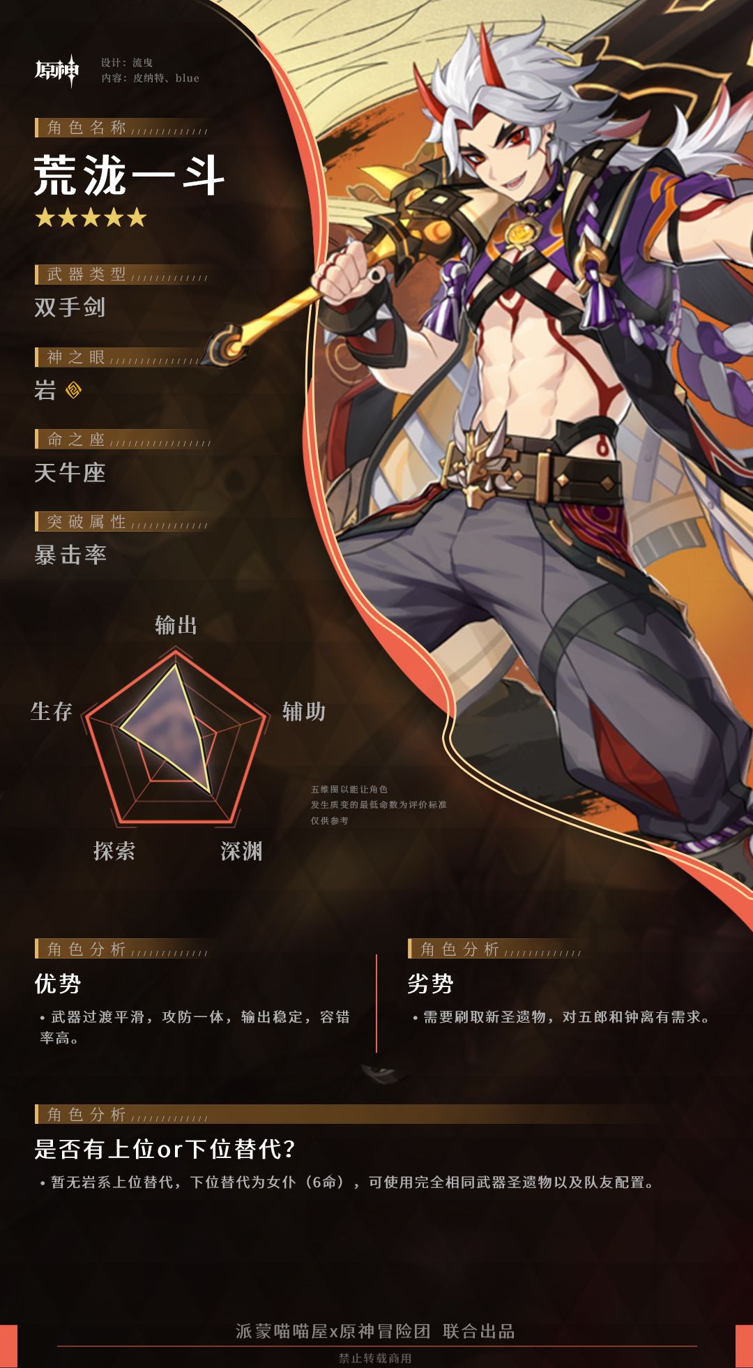 目前五郎靠着6命的40%爆伤加成有以及15%岩伤加成和10级370以及被动的25%防御力提升,稳居一斗的第一位辅助,不过6命五郎抽取不易,投入与3命一斗接近。非6命五郎能够提供的加成则较为有限,但任然是岩系中能提供最高加成的岩辅,所以相当推荐优先配置
