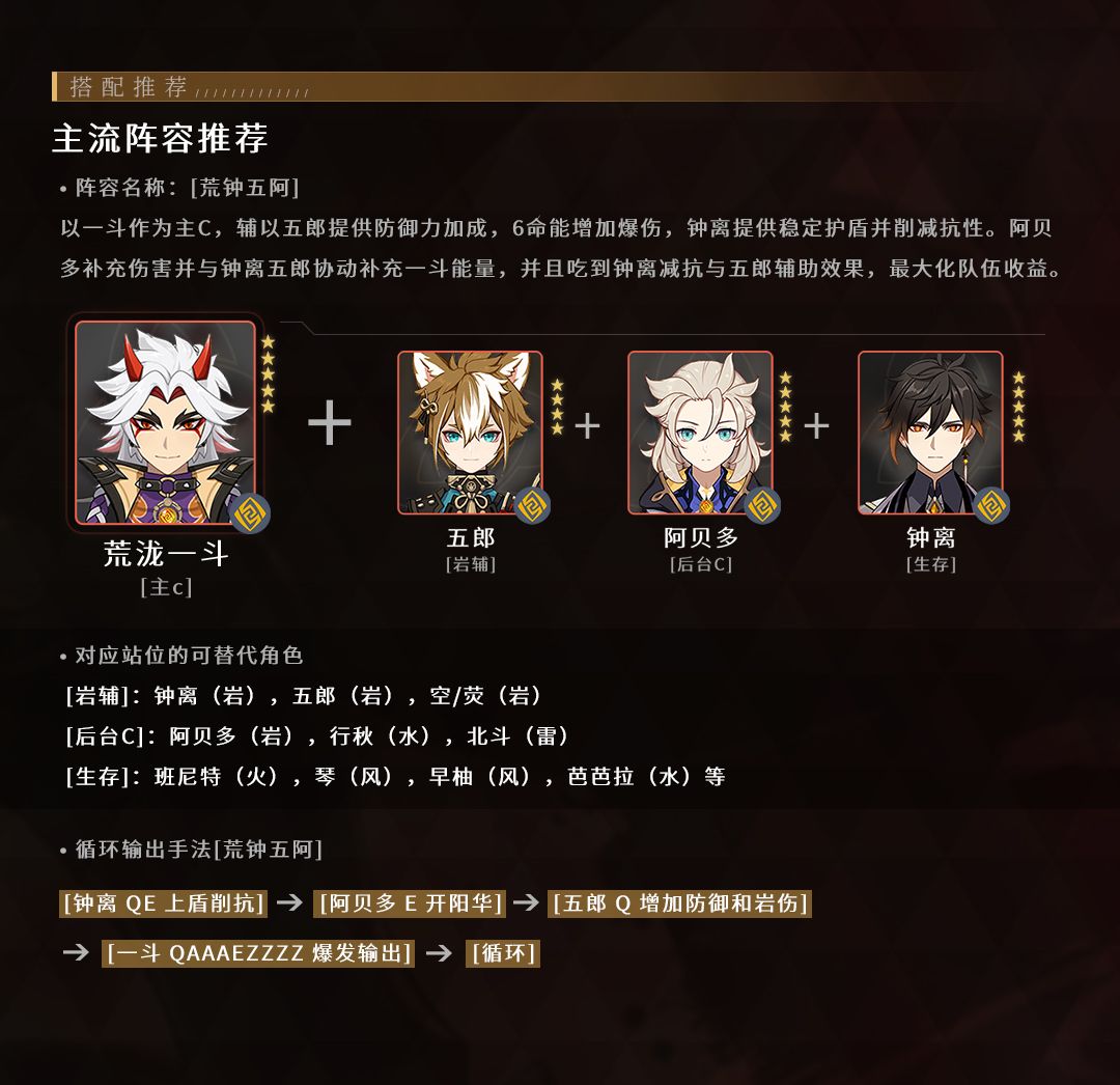 钟离护盾输出最低并且能提供抗性削减优先释放,换出五郎释放旗帜,换出阿贝多吃到五郎提供的防御力加成释放阳华,如果怪物较多且分散可以释放元素爆发补充对群输出,仍有少血群怪在攻击范围内可以用钟离再补出大招清理,最后换五郎开出领域重新上buff并切出一斗开大进行爆发处理余下高血量大怪以及对余下小怪进行补刀。