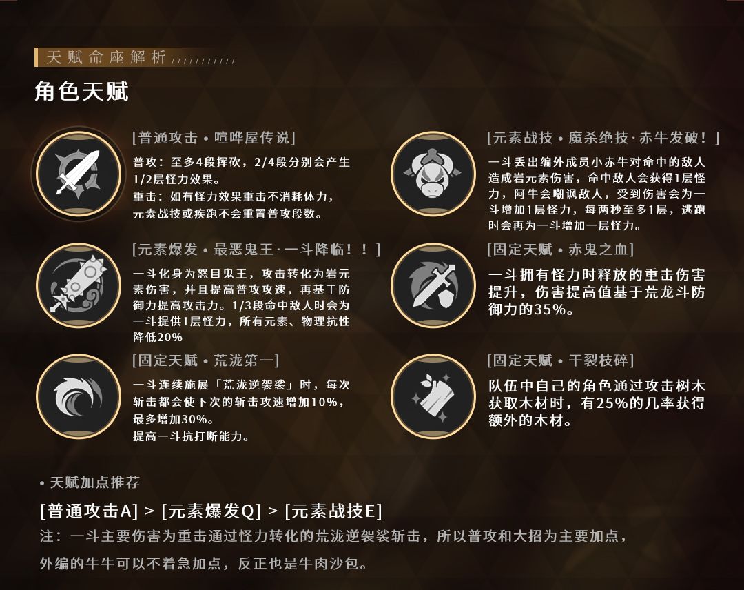 一斗施展拥有【乱神之怪力】的重击时,造成的伤害提升,提升值基于一斗防御的35%