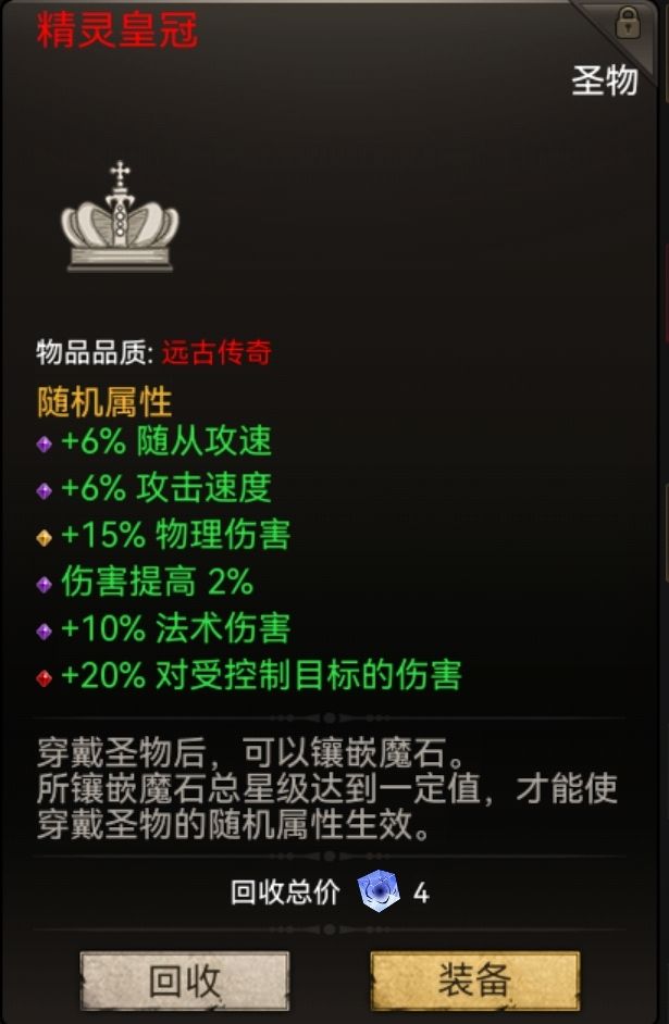 圣物,发一个不够完美的,我心中的圣物完美属性依次是:20%对受控目标伤害,法伤/20%,生命提高4.8%,伤害提高4%,12%随从攻速,会心率8%,会心效果20%
