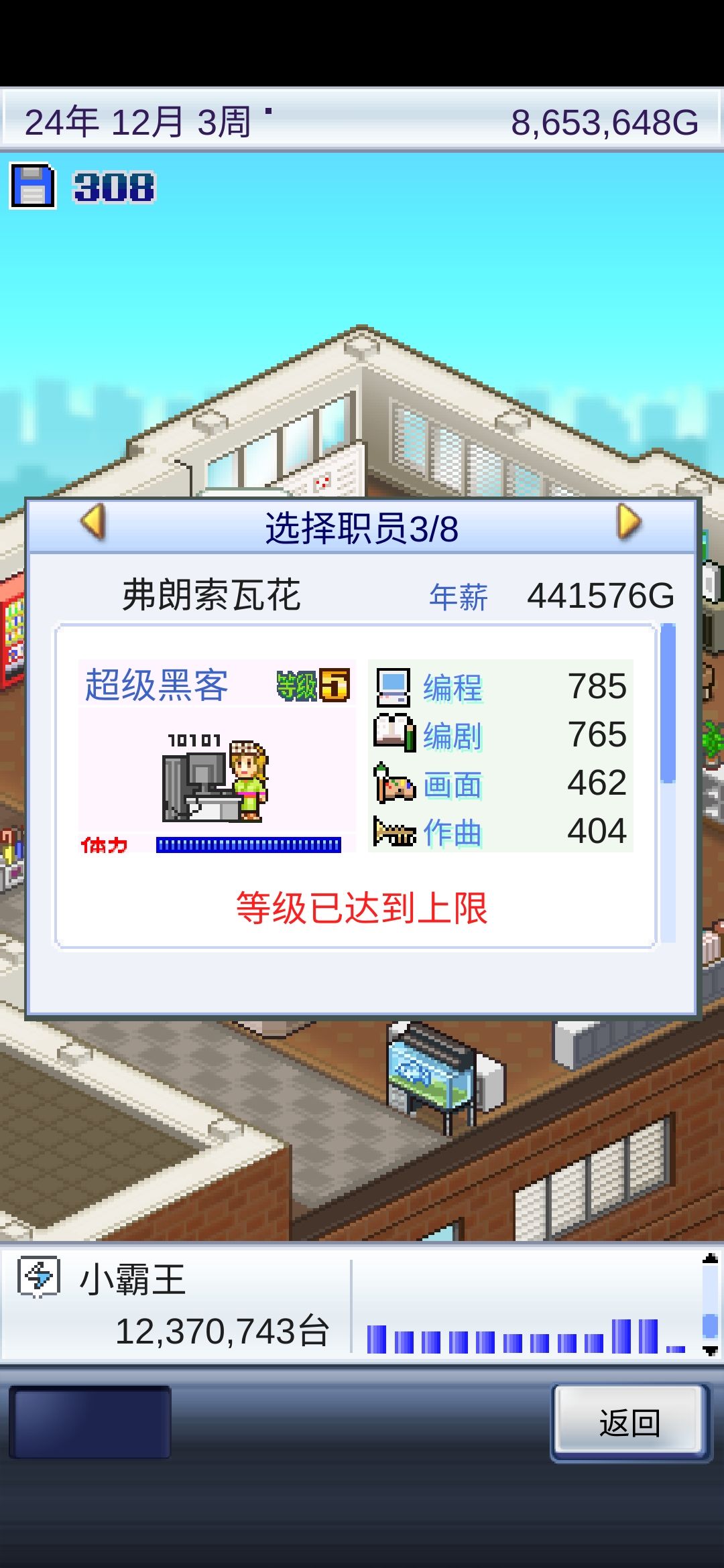 当你钱够了,你就会想着提高人物能力以及开发主机,但是猴子是18年左右才会来,等那个时候,黄花菜都凉了,这个时候,就得硬造硬件工程师(硬件工程师是要把程序员,剧本,音效,总监,制片人,美术职业都要到满级,等硬件工程师满级的时候,就可以解锁超级黑客职业。)很多时候,你们都是想着培训,毕竟培训是最主观能够看到能力变化的,但是,最加能力的,其实是转职,一个最垃圾的程序员,硬造到超级黑客,其平均能力至少都有200点,你要想想看,12到200是什么概率,20倍的差距,懂吗?这个时候,你之前买的转职书就用上了,先造两个之前招的超级黑客,把他们所有的职业都拉满,然后变回到超级黑客,你会发现,能力翻番是正常现象,培训什么都是弟弟。这个时候,办公室8个人,7个黑客,一个硬件工程师就够了,没研究数据去打委托,基本上5个月能刷700个左右,很简单。