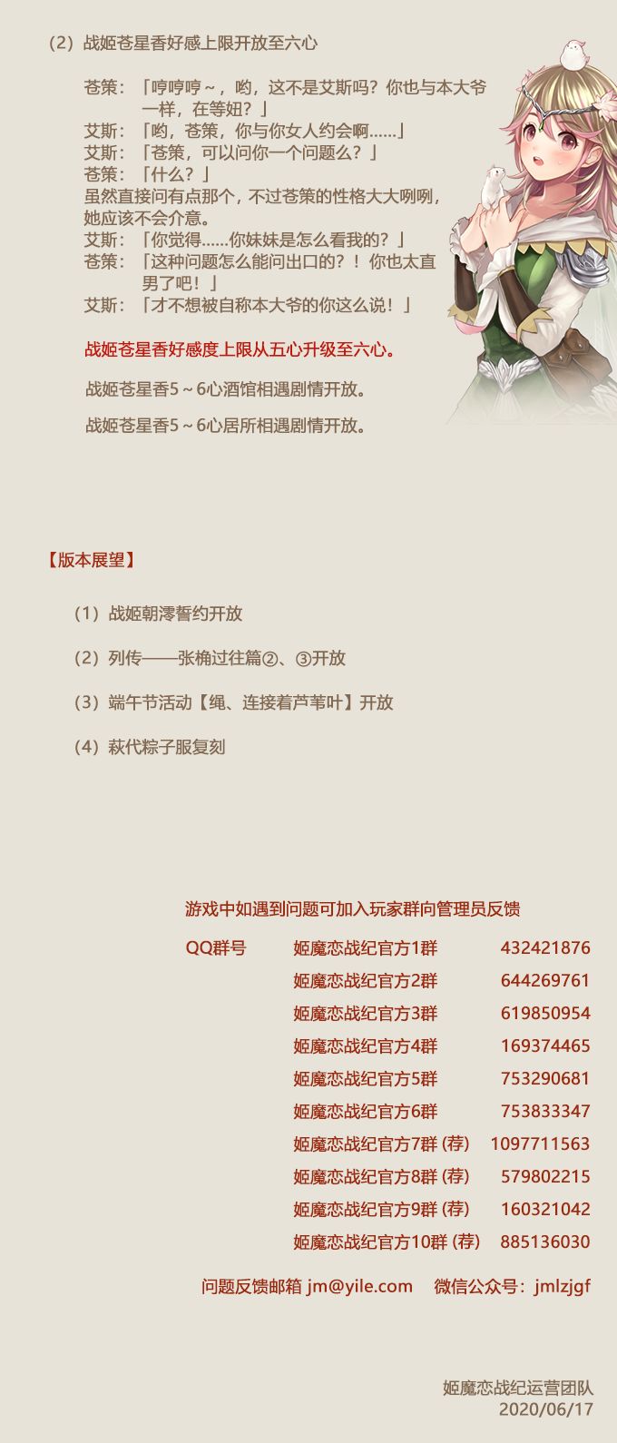本次更新后将开放战姬华雫的好感至七心&战姬苍星香好感至六心。
