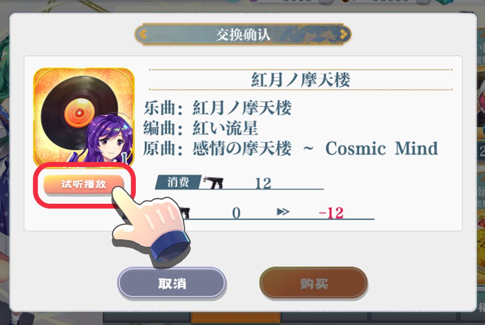 交换所中选择交换音盘时,点击试听再生按钮,可以在交换前确认想要交换的乐曲。
