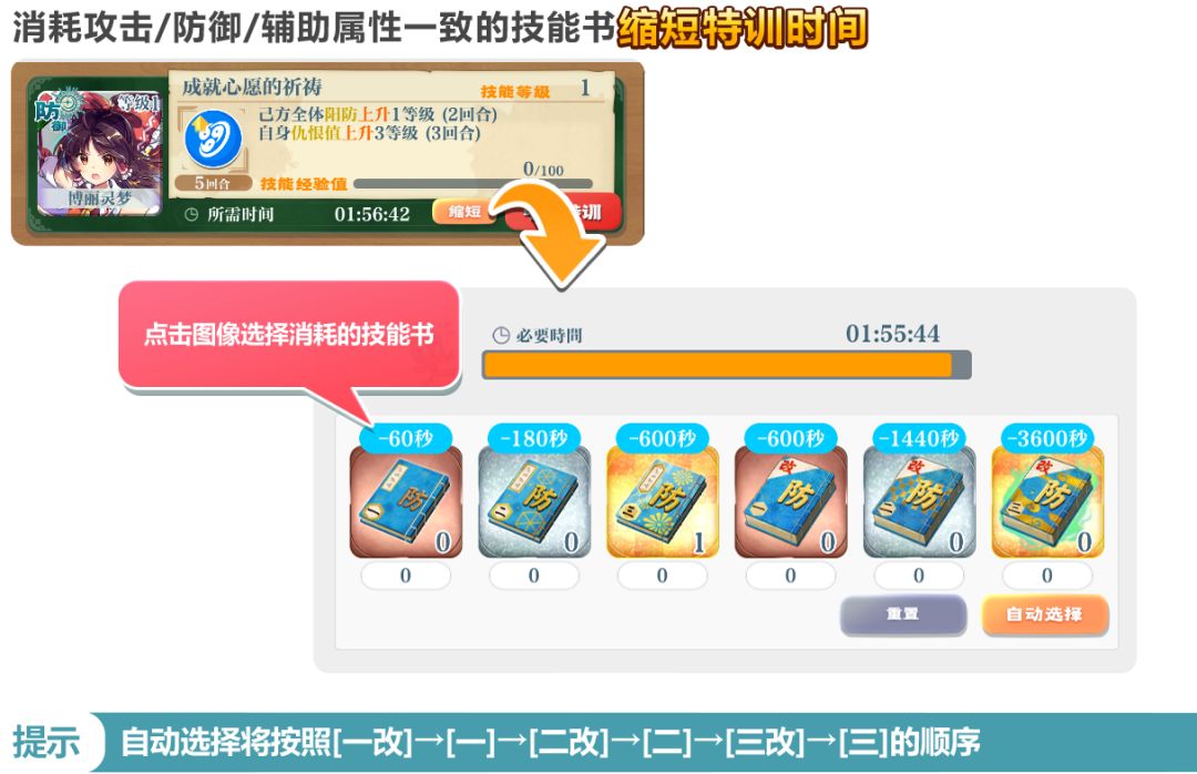 「道场」中点击缩短按钮,追加投入指南书,可以缩短伙伴技能经验值获得时间。