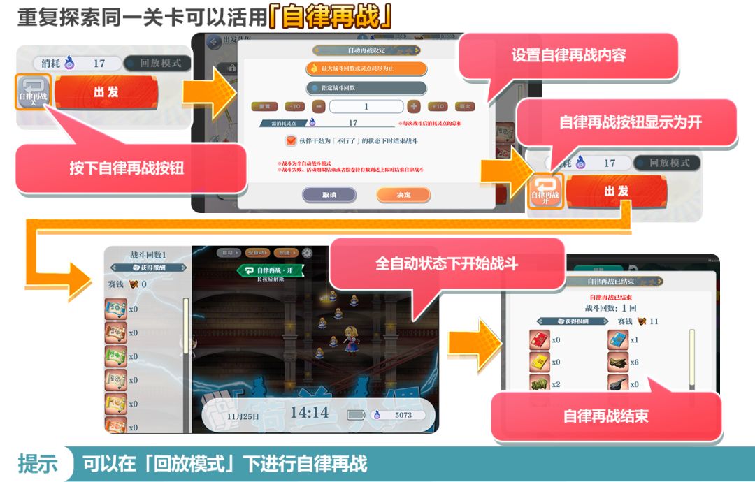 仅★★★通关的探索关卡可以使用「自律再战」。设定完自律再战后直接选择出发,伙伴会在全自动模式下进行战斗。若在「回放模式」中出发,则会在记录好的行动下进行战斗。