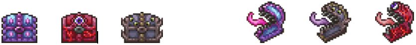 自闭模式:停止移动缩入宝箱,进入无敌模式并且反弹弹幕(专家模式)。请十分注意观察!在它们自闭的时候立刻停止攻击,不然有很大的概率让你见识一下“是我!杀了我!”