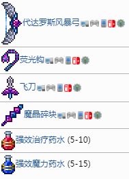 击败大型宝箱怪时会必定掉落7金50银和一些强效治疗药水和强效魔力药水。此外它们还分别掉落如下独特的战利品: