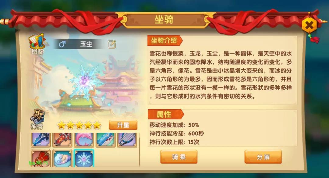 坐骑2:玉尘雪花也称银粟,玉尘则是一种晶体。雪花由小冰晶增大而来,而冰的分子以六角形最多。每一片雪花都有自己的体态,有自己的故事,就像每个人都是独一无二。同样获得此坐骑后,其基础移动速度加成更高。而在使用“特殊灵魂”升星后,移动速度加成会更高,神行技能冷却时间会更短,神行次数上限也会更多。