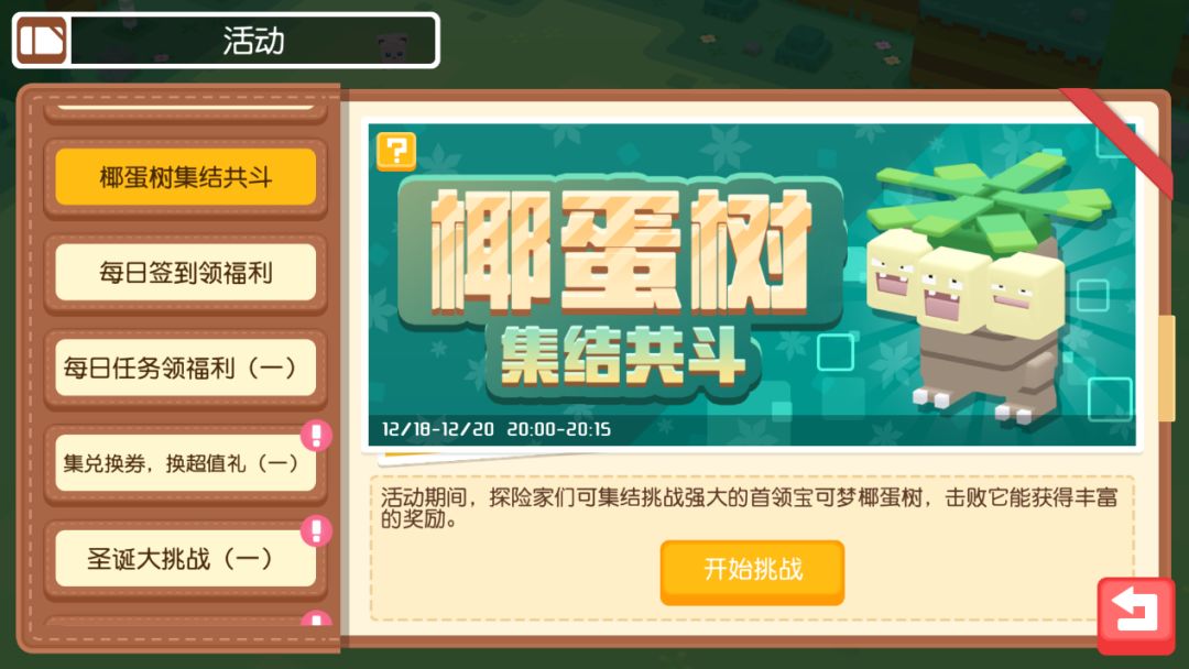 12月18日-12月20日、12月25日-12月27日、1月1日-1月3日, “集结共斗”活动面向全服探险家开放,玩家可集结挑战强大的首领宝可梦:椰蛋树、大竺葵和急冻鸟,击败他们可以获得丰厚的奖励。