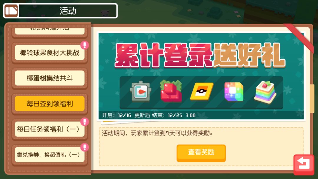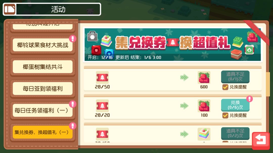 2021年12月16日-2022年1月6日,玩家参与活动,可以获得圣诞兑换券,兑换券可以在兑换活动中兑换活动食材-椰铃球果、彩虹松糕等道具。